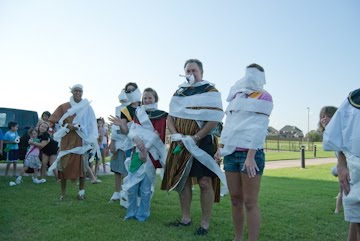 Already the children have been hunting (with hula hoops) and fishing (with watermelons), and they have turned willing volunteers into mummies!